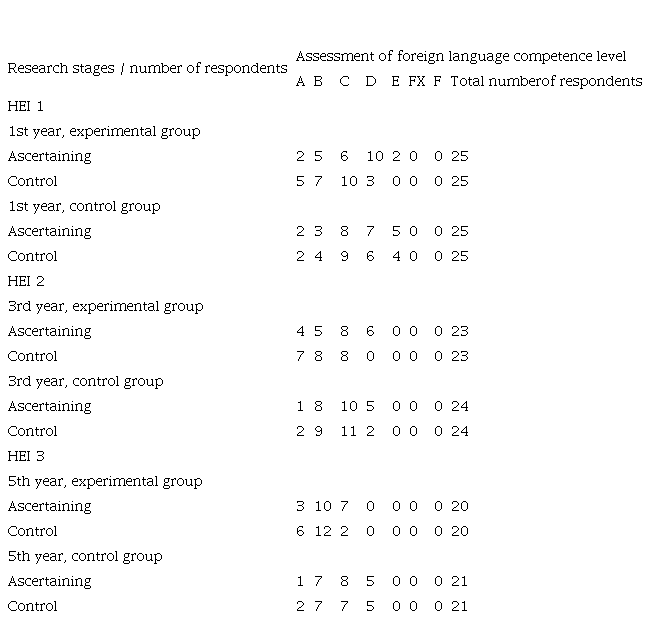 Monitoring and experimental procedures involved the total of 138 students aged between 17-21. The introductory monitoring was conducted at the beginning of the first semester of 2020/2021 academic year. The author's model wasintroduced during the first semester of the academic year. The control stage of the experiment was implemented in the second semester of 2020/2021 academic year. The only difference in the implementation of the model in the first, third and fifth years, respectively, is the volume and complexity of lexical and communicative material, while the concept of the model itself remains unchanged.