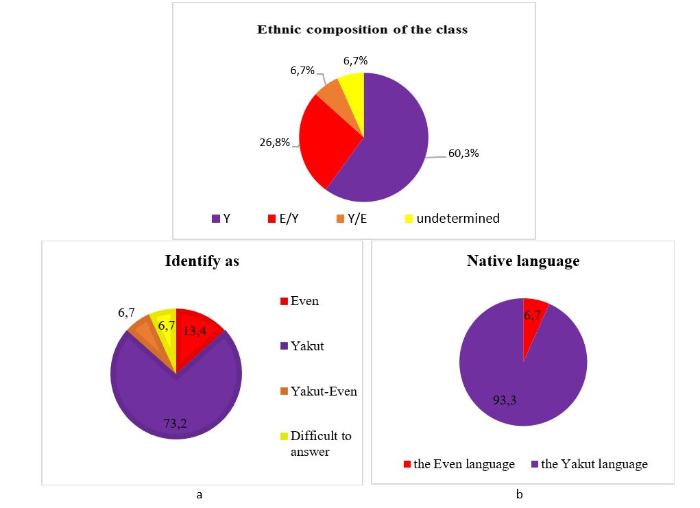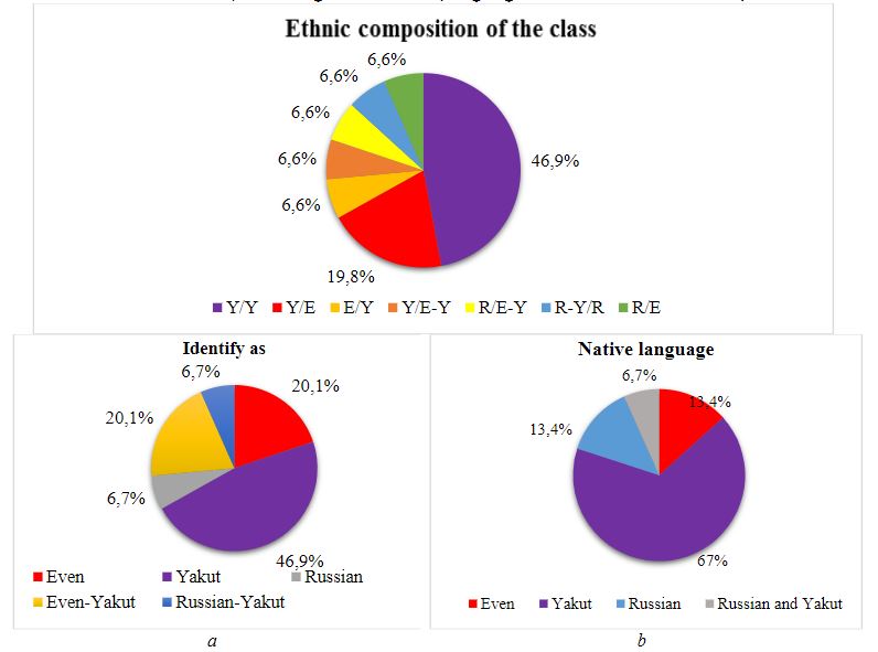 In the course of the survey, all students indicated which ethnos/ethnoses they believe they are members of and specified the ethnicity (ethnicity) of their parents and their native language. In the interpretation of the survey data in tables and diagrams, the ethnicity of a child and their parents is signified with the first letter of the title of the ethnic group, for example, Y – Yakut, E – Even, R – Russian. For a child from a mixed family, the ethnicity of the parents is put through a fraction – the father’s ethnicity at the top and the mother’s at the bottom, for example, E/Y: Even father, Yakut mother. If a child identifies themselves or their parents as having two ethnicities (they or their parents come from a mixed family), the designations are written with a hyphen, e.g., R-E – Russian-Even (Russian father, Even mother).