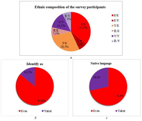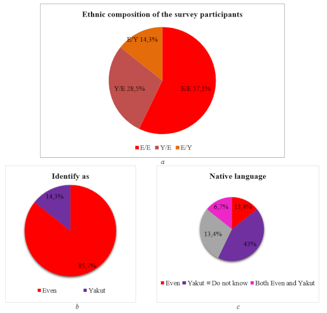 In identifying their native language: 10 students (71.4%) select Even, of them: four people (28.5%) from E/E families; three people (21.4%) from Y/E families, one person from a Y/Y family; one person form an E/Y family; one person with an Even mother and unknown ethnicity of the father; four students (28.5%) consider Yakut as their native language: one person form a Y/Y family; one person from a Y/E family; one person from a family with unknown ethnicity of the father and a Yakut mother; one person from an E/E family.