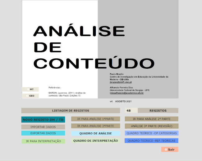 Foi utilizada a ferramenta FileMaker Pro v18, elaboradora de bases de dados relacionais, da Claris International Inc, desenvolvido para o Windows. Para além de organizar os recortes categorizados e subcategorizados dos textos, o programa contém conexões com um módulo de interpretação dos dados, uma vez que estabelece uma relação direta entre a análise dos recortes obtidos e os referenciais teóricos, selecionados para fundamentar a interpretação dos fenómenos, conforme Figura 1.