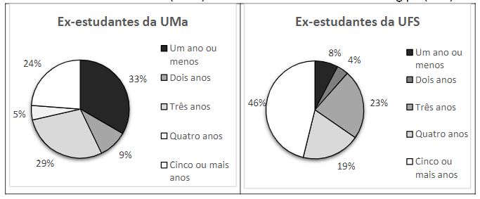 Relativamente ao tempo decorrido após a conclusão do curso de formação na Universidade da Madeira (UMa) e na Universidade Federal de Sergipe (UFS), verificamos ainda o seguinte: