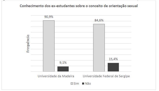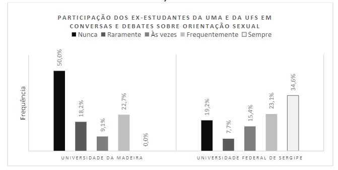 Comparando os resultados, verifica-se que há maior conhecimento sobre o conceito de orientação sexual entre os ex-estudantes da UMa, mas também se observa um envolvimento maior dos ex-estudantes da Universidade Federal de Sergipe na discussão do tema orientação sexual. Em oposição, as respostas dos ex-estudantes na Universidade da Madeira confirmam a pouca adesão a essa iniciativa.
