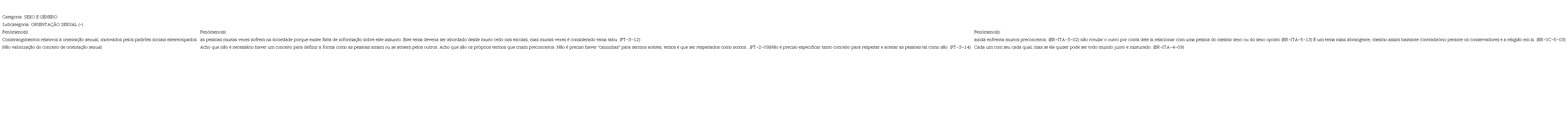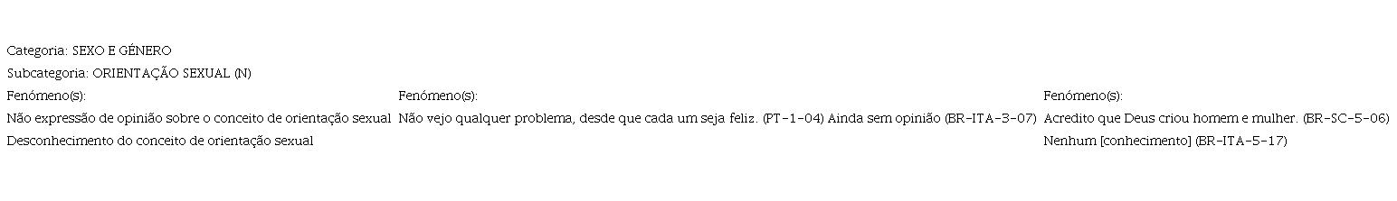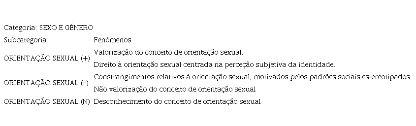 Assim, para considerações positivas acerca do conceito de ORIENTAÇÃO SEXUAL (+) categorizou-se os fenómenos da seguinte forma: valorização do conceito de orientação sexual; direito à orientação sexual, centrada na perceção subjetiva da identidade.