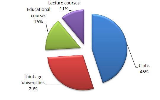 To classify the organizational forms of the elderly education projects, the following attributes were used: self-identification (usually reflected in the name of educational projects); orientation (education, rehabilitation, leisure, etc.); period of training; training format; requirements for the teaching staff’s qualifications; types of institutions as venues and participants of educational projects and events. The organizational forms of the elderly education projects implemented in Russia fall into four categories: clubs, lecture courses, educational courses and third age universities.