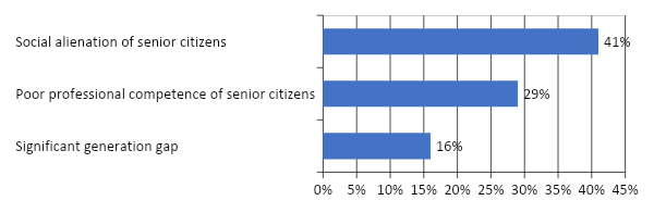 Poor professional competence of senior citizens. In the context of population aging, there is an urgent need to exploit the residual working capacity of older adults. At the same time, the lack of up-to-date professional knowledge and skills prevents senior Russians from integrating into the production and economic sphere, increases their vulnerability in the labor market, and limits their employment opportunities to low-paid unqualified jobs (Ambarova & Zborovsky, 2019).