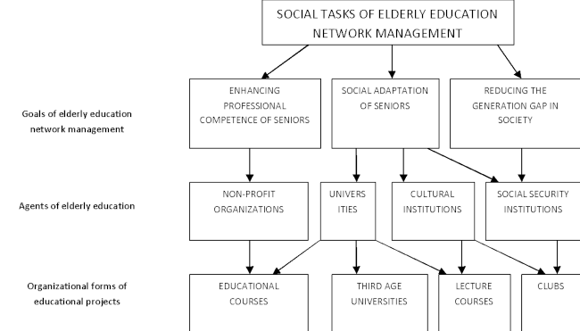 In figure 3, the goals of elderly education network management are integrated into blocks that were earlier referred to as social guidelines of elderly education management. Tasks for achieving them are distributed between the leading agents of elderly education (the most common founders of educational projects). There are no public authorities among the agents, since they promote elderly education mainly through sponsorship, so it seems not possible to define their role in the scheme of functions. The forms of educational projects were determined according to the compliance with the specific tasks of gerontology, their popularity with the educational agent, and the possibility of implementation. According to the principle, the functions of elderly education are differentiated in order to increase the efficiency of elderly education network management and the rational use of its resources.