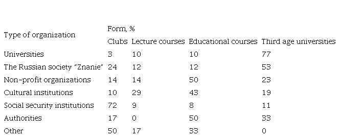 Population ageing gives rise to a number of negative trends. The most effective mechanisms of adaptation to the ongoing changes are associated with the active integration of older people into all spheres of social life and an increase in their educational level. Non-formal educational projects can bear a significant part of the burden associated with training for the elderly. Elderly education projects in Russia are implemented in four forms. According to the research results, the form in which the project is implemented is largely determined by the type of organization on the basis of which it operates. The most common form of elderly education is the third age university (77% are organized on the basis of universities, and 53% – on the basis of the Russian society “Znanie”). Non-profit organizations, cultural institutions and authorities gave preference to the format “educational courses” (50%, 43% and 50% respectively). At social security institutions, the overwhelming majority of educational projects were implemented in the form of clubs (up to 72%). No authorities named lecture courses as their preferred format, unlike cultural institutions, which practiced it in 29% of cases.