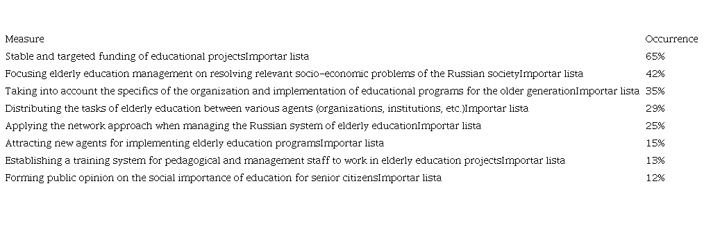 At the next step of the expert survey, the respondents were asked to name measures aimed at ensuring effective management of the elderly education in Russia. The respondents’ answers are given in table 2.