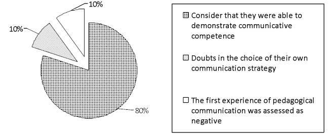 The results of the study reflected in the diagram confirm the effectiveness of the prescribed in the educational and professional training program for the specialty “Elementary education” strategy for the formation of communicative competence of a specialist. However, along with the positive aspect, we also see that some of the students either felt insecure or were completely disappointed. With this trend, there is a high probability that these 20% of the respondents will not choose the specialty of elementary school teacher and in the future will avoid the socio-nomic profession where communication with people is assumed. The predominant group of student practitioners chose leading classroom practices that helped them establish a quality learning relationship with students to achieve a successful communicative goal. These included interactive pedagogical communication exercises, which were divided according to the difficulty of implementation: easy – “Acquaintance”, “Krygolam”, “One Minute”, “Give a Flower”, “Unfinished Proposal”; medium – “Blitz Discussion”, “Round Table”, “Aquarium”, “Role Play”, “Hat Method”; complex – “Four Views”, “Write a Tale”, “Tornado”, “Public Forum”, “Debate”, etc.