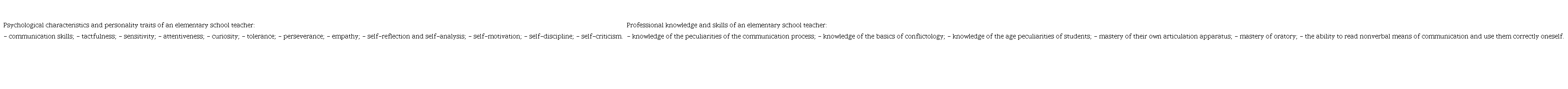 The student opinion leaders highlighted the building blocks of their successful teacher communication, the elementary school teacher: self-confidence, possession of one's own voice, its power; perfect skills in speech and speech; high moral values; an interest in current global trends, close to the students; familiarity with the exact sciences and humanities; knowledge of age-specific features of students' development, etc. Based on the research conducted and described by Avramenko & Parkheta (2019), Zotova (2020), Radzhabova (2020), Kholkovska (2019), and based on the results of the conducted pedagogical experiment, we compiled a table “Components of communicative competence” where the structural elements of communicative competence of a specialist are highlighted (Table 1). We differentiated them into two categories: “Professional knowledge and skills of an elementary school teacher and Psychological characteristics and personal qualities of an elementary school teacher”.