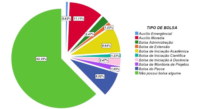 Bolsa de Iniciação Acadêmica (BIA): centrada na inserção do estudante-bolsista no mundo acadêmico e profissional, sob orientação de docentes e servidores técnico-administrativos da Universidade, consistindo de uma contraprestação no valor de R$ 400 e recebido por 8,64% da amostra;