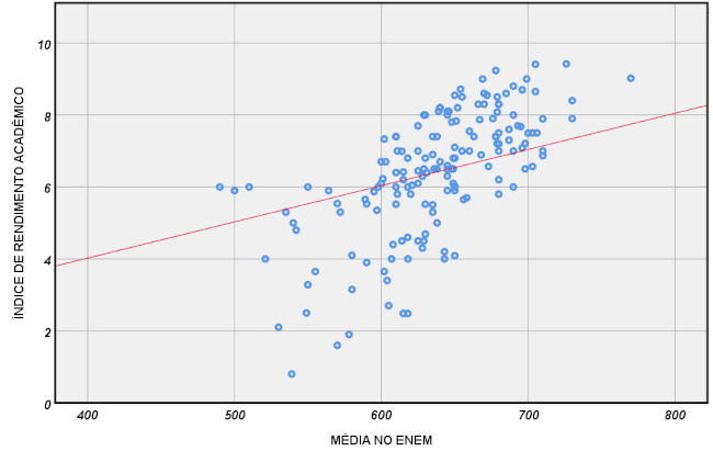 De maneira quantitativa, as variáveis médias do ENEM e do IRA possuem correlação de Pearson de 0,653. Vale destacar que o coeficiente de correlação de Pearson (ρ) compreende um indicativo vultoso de correlação entre as supracitadas variáveis quantitativas e seu valor representa a eficiência e a relação linear entre essas.