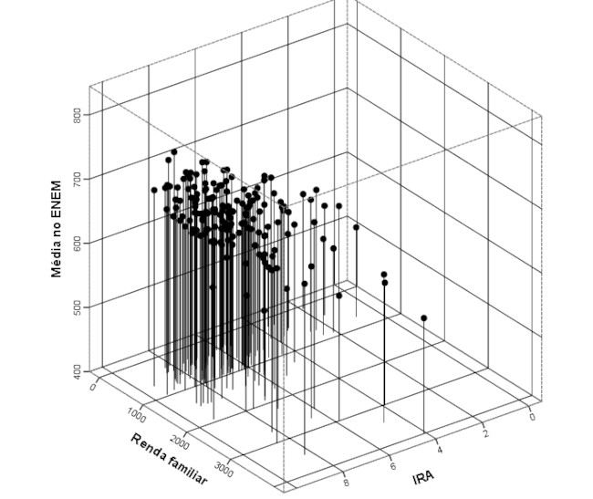 É perceptível observar que uma família com elevada arrecadação não se traduz em aumento significativo na média do ENEM, nem tampouco no rendimento acadêmico (IRA), fato este confirmado ao se extrair as correlações de Pearson do modelo. A correlação de Pearson entre a média no ENEM e na renda familiar é de 0,06, enquanto que a correlação entre o IRA e a renda familiar é de 0,14, ambas consideradas desprezíveis, a um nível de significância de 1%.