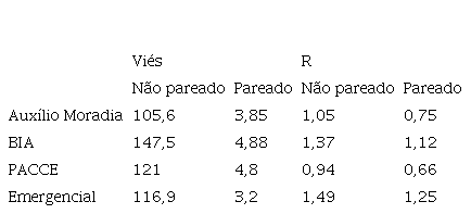 Os autores ainda afirmam que a razão das variâncias do escore de propensão e as variáveis dos grupos de tratados e controle representado por R, deve estar entre um intervalo de 0,5 e 2. Ademais, uma das principais estatísticas de interesse para o correto balanceamento é o viés após o pareamento, o qual é desejável que obtenha um valor abaixo de 5%, de acordo com Grilli e Rampichini (2001).