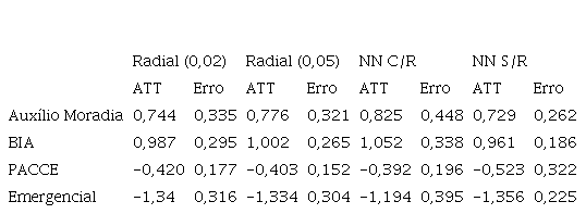 Deve-se esclarecer que na Tabela 2 a sigla ATT (Average Treatment Effect on Treated) significa “efeito médio sobre os tratados” e o termo “Erro” se refere ao erro inerente aos cálculos estatísticos e referentes a essa amostra. Ademais, os métodos utilizados podem ser definidos conforme Maffioli (2011, apud AMARAL, 2011):