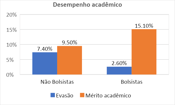 Em relação às taxas de evasão escolar, cabe comparar os estudantes beneficiados pelas políticas de assistência estudantil com aqueles com maiores níveis socioeconômicos, que ingressam e permanecem assegurados por seu status social. Nesse sentido, a taxa de evasão escolar é menor entre os bolsistas. Os dados dos relatórios mostram que apenas 2,6% dos alunos bolsistas desistem da graduação. Entre os demais alunos, essa taxa é quase três vezes maior, com média de 7,4% no período estudado. Esses valores são importantes para demonstrar a importância de o programa garantir a permanência do estudante em vulnerabilidade socioeconômica na universidade. Além disso, em média, 15,1% dos bolsistas foram contemplados por programas de mérito acadêmico, como iniciação científica, extensão, dentre outros. Essa participação entre os demais alunos é de apenas 9,5%. Os valores mostram que a bolsa de auxílio do PNAES tem contribuído para o melhor desempenho acadêmico dos alunos, conforme disposto na figura 5.