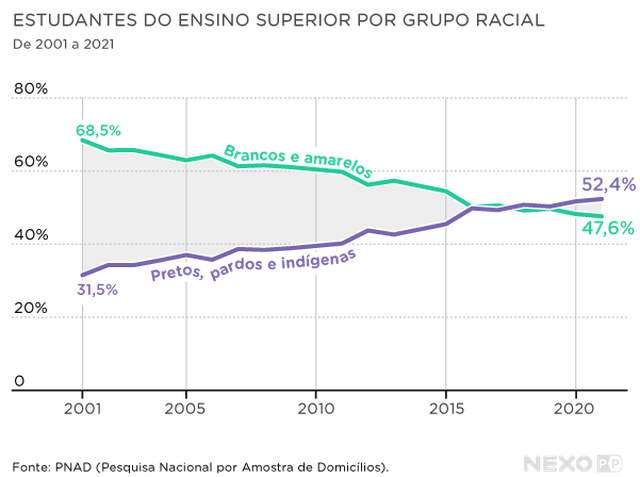 O Grupo de Estudos Multidisciplinar da Ação Afirmativa (GEMAA), ao apresentar o relatório das desigualdades de raça, gênero e classe (2021), afirma que, em 2001, 68,5% dos estudantes do ensino superior brasileiro se declaravam brancos e amarelos enquanto 31,5% dos estudantes se declaravam pretos, pardos ou indígenas. Conforme o gráfico 1, a análise do grupo mostra que, em 2021, a maioria dos estudantes do ensino superior é composta por pretos, pardos e indígenas, totalizando 52,4%, um número expressivo diante dos 47,6% que se autodeclaram brancos e amarelos. Quando os dados são expressos em números absolutos, o número de estudantes pretos, pardos e indígenas subiu de 318.457 em 2001 para 1.268.046 em 2021. Já a expressão dos números absolutos de estudantes brancos e amarelos avançou de 691.465 para 1.153. 368.