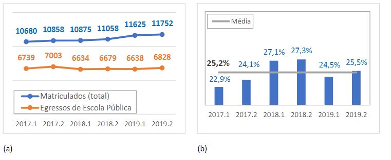 Os relatórios revelam que, em média, 11.141 alunos estavam regularmente matriculados no ensino presencial na instituição (Relatório de Avaliação, 2017, 2018, 2019). Destes, 25,2% receberam auxílio do orçamento destinado via PNAES e 60,7% são egressos de escola pública (Figura 1). Esse último dado se aproxima das estatísticas apresentadas pela V Pesquisa Nacional de Perfil dos Graduandos (2019). Segundo a pesquisa, em 2018, 64,7% dos estudantes das instituições federais de ensino superior cursaram o ensino médio em escolas públicas. Quanto aos estudantes oriundos de escola pública, 36,8% deles foram contemplados com auxílio do PNAES.