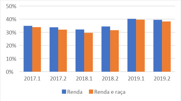 No período estudado, em média 35,8% dos alunos cotistas com renda de até 1,5 salário mínimo per capita receberam bolsa do programa. No recorte dos cotistas de renda e raça, os valores são semelhantes: 34,2% desses receberam bolsa. Ao verificar os alunos que ingressaram na UFOP através da política de cotas, os relatórios informam que os auxílios destinados via recursos PNAES atendem pouco mais de um terço desses (Figura 2).