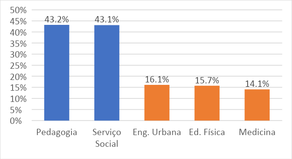 Nesse sentido, ao analisar os cursos de graduação na UFOP, pode-se observar que os cursos de Serviço Social e de Pedagogia foram os que apresentaram maior índice de alunos bolsistas. No curso de Serviço Social, 43,1% dos estudantes receberam bolsa de auxílio no período analisado, enquanto, no curso de Pedagogia, essa proporção é de 43,2%. Nesses cursos estão matriculados discentes que, em sua maioria, estão em situação de vulnerabilidade socioeconômica. Por outro lado, o curso de Medicina teve apenas 14,2% de seus discentes contemplados com bolsa, sendo o menor índice da UFOP no período. Outros cursos que apresentaram baixos índices em períodos diferentes foram Engenharia Urbana (2018, com 16,1%) e Educação Física (2019, com 15,7%).