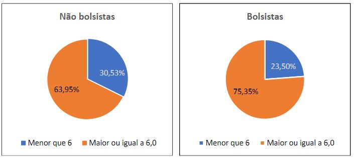Quanto à variável do desempenho acadêmico, um aspecto importante merece ser observado. Os discentes bolsistas tiveram melhor coeficiente médio que os demais alunos em vários índices analisados. Entre os bolsistas, 75,4% tiveram coeficiente médio acima de 6,0 no período. Já entre os demais alunos, esse índice foi de 64% (Figura 4).
