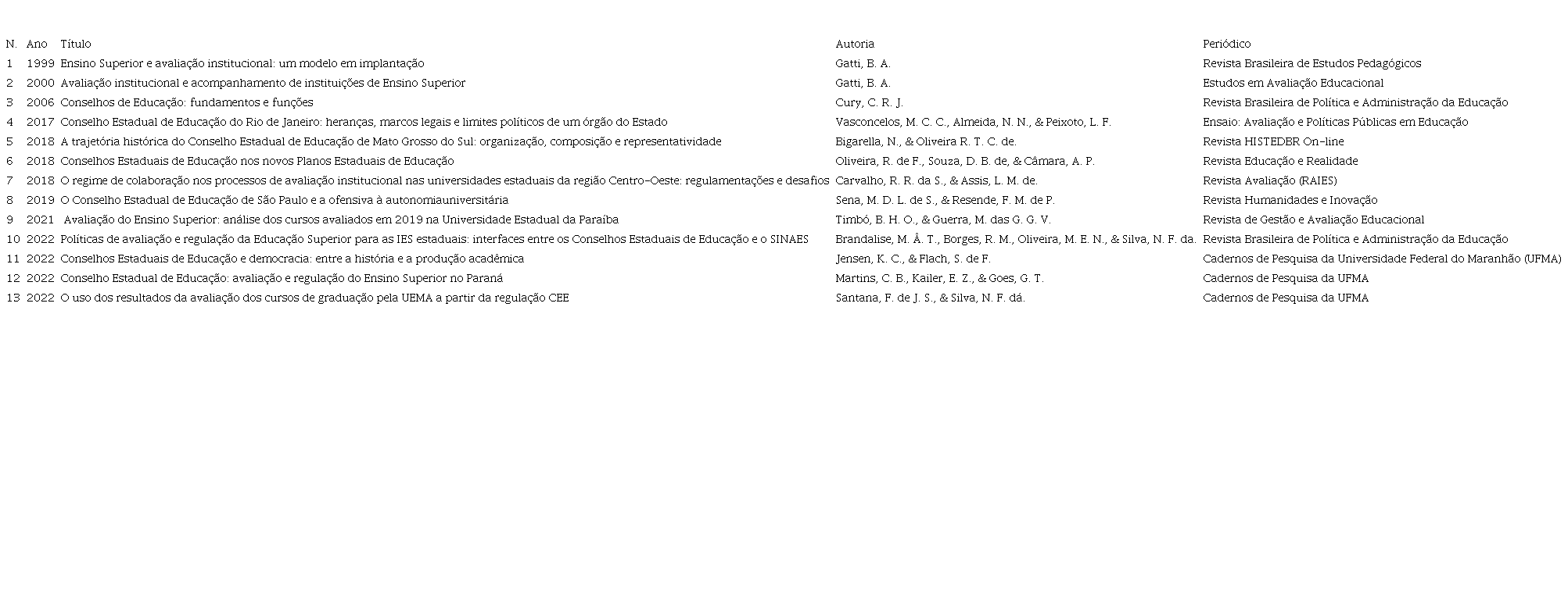 Neste estudo, trazemos a análise da produção acadêmica no formato de artigos científicos publicados em periódicos brasileiros, em que a atuação dos CEE sobre os processos de avaliação e regulação da Educação Superior foi objeto de estudo e de análise.