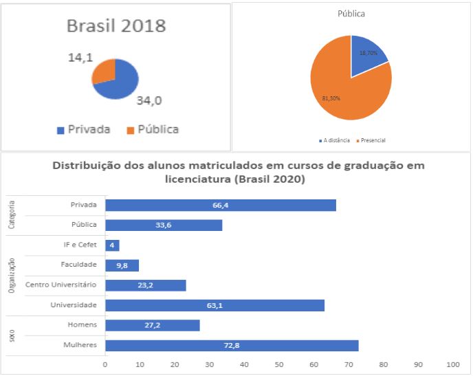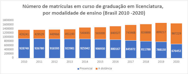 Segundo dados do INEP, “Pela primeira vez na série histórica, o número de alunos matriculados em licenciatura nos cursos à distância (50,2%) superou o número de alunos matriculados nos cursos presenciais (49,8%).” (INEP, 2018, p.25). Em 2020, este número aumentou de forma expressiva, “em relação à modalidade de ensino, as matrículas em cursos de licenciatura presencial representam 40,7%, enquanto a distância são 59,3% no total de matrículas” (INEP, 2020, p.28).