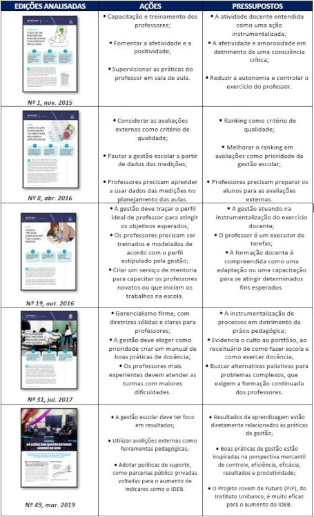 De forma geral, a análise do Aprendizagem em Foco evidenciou que, na concepção do periódico, a qualidade da educação está diretamente relacionada às práticas de gestão que estão muito mais próximas do universo empresarial e mercantil do que propriamente à gestão escolar. As ações pautadas nas edições analisadas nos permitem esse diagnóstico, conforme estampa o Quadro 01.