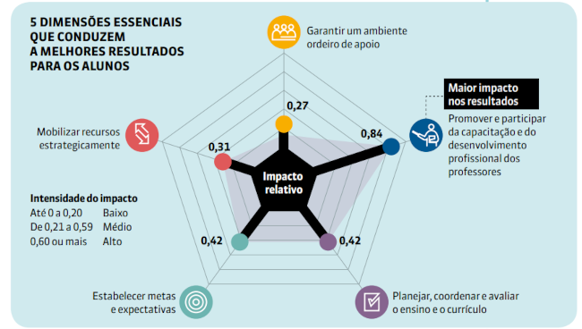 A Figura 01 é utilizada no periódico para ilustrar as dimensões fundamentais para condução dos estudantes aos melhores resultados. Dentre as dimensões apontadas, destacam-se duas: utilizar os recursos existentes de forma qualificada e estabelecer metas e expectativas para alcançar os efeitos desejados. O primeiro, parte do pressuposto que todas as escolas possuem recursos adequados para serem utilizados a serviço dos processos de aprendizagem, deixando-se de lado os contextos desfavorecidos, como, por exemplo, aqueles em que há infraestrutura precarizada e a escola situa-se em áreas periféricas e de violência.