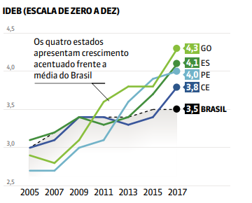 Avançando na nossa análise, na edição de número 49, de março de 2019, o periódico destaca como matéria de capa “As lições dos quatro estados líderes no IDEB”. Conforme o editorial, Goiás, Espírito Santo, Pernambuco e Ceará tiveram esses resultados como fruto de políticas próprias no ensino médio, mas em comum, entre todos os estados, está a gestão com foco nos resultados de aprendizagem combinada com apoio intensivo às escolas.