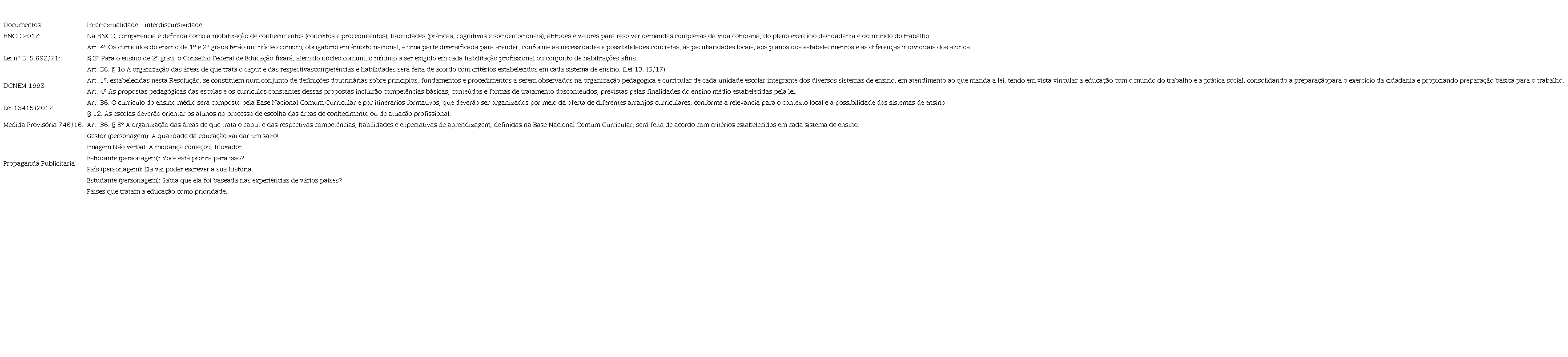 Essa escolha investigativa ocorreu em face da urgência adotada na elaboração e implementação da BNCC, e como essa política investiu discursivamente em torno de um consenso de inovação educacional. Pretendemos enxergar potencialidades de analises na interdiscursividade e intertextualidade como maneiras de captar contradições dentro do texto oficial da BNCC de 2017 e as propagandas publicitárias do Novo Ensino Médio.