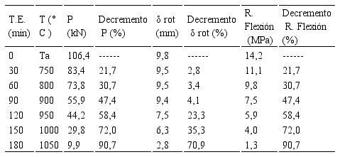 En la Tabla 2 se presenta el promedio de los datos de las tres vigas para cada tiempo de exposición al fuego (T.E.): temperatura superficial promedio (T), carga máxima promedio (P), deflexión a la rotura promedio (δ rot), y resistencia a la flexión (R. Flexión). También a partir de los promedios se calcula el decremento de P, δ rot, y R. Flexión en relación a los datos obtenidos en el T.E.=0 min (sin exposición al fuego) en el cual la temperatura referida considerada será la temperatura ambiente (Ta).