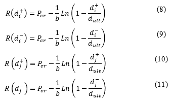 Se considera la representación de la evolución del daño por pandeo local como una función de tendencia logarítmica mostrada en las ecuaciones (8), (9), (10) y (11), donde el parámetro b está relacionada con la velocidad del daño, mientras más alto sea el valor de b el pandeo local evoluciona de manera más rápida. La expresión usada en el modelo matemático que se ajusta al comportamiento descrito anteriormente, se denomina resistencia al pandeo local R(d), representa la rapidez del avance del daño con respecto a la rotación plástica. Las ecuaciones (8) y (9) expresan la resistencia al daño en el nodo i por momentos negativos y positivos, y las ecuaciones (10) y (11) la resistencia al daño en el nodo j.