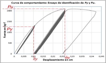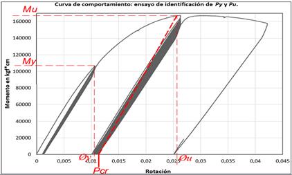 Con la realización de un primer ensayo [5], se logró obtener los límites para definir las historias de desplazamientos a ser impuestas en el resto de los ensayos experimentales, estos límites fueron Py=1250kg, δy=0,762cm, Pu=2088kg y δu=2,075cm (ver Figura 7). Con estos datos se ejecutaron dos ensayos de amplitudes ±1,2cm y ±1,6cm, cuyos resultados fueron comparados con los resultados numéricos modelados mediante el elemento finito descrito en la investigación [3]. El parámetro Pcr representa la rotación alcanzada en una curva de momento vs rotación, de un ensayo monotónico como se muestra en la Figura 8, a partir de la cual las pendientes de descarga en cada ciclo comienzan a disminuir debido al incremento y evolución del daño, lo que implica una degradación de la resistencia del perfil.