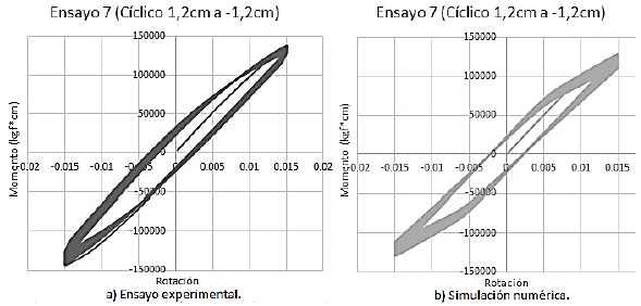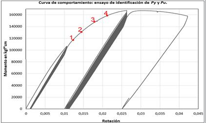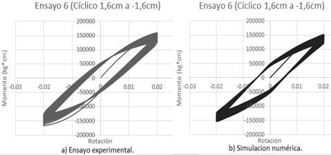 Todos los ensayos descritos están referidos a la investigación [5], donde se trata a detalle los procedimientos usados para realizarlos. Para la simulación del ensayo de amplitud ±1,6cm se tomó en cuenta el modelo de FUBC aplicando el modelo matemático mencionado anteriormente [3], y se puede observar en la Figura 13 que la máxima rotación plástica que puede ocurrir en este ensayo es 0,004622 y un momento máximo de 155.000 kgf*cm, sin embargo mediante la acumulación de rotaciones plásticas