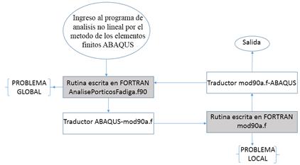 El problema local se resuelve mediante el uso de la rutina “mod90a.f” basada en la teoría de pórticos y la Teoría de Daño Concentrado [8], esta rutina resuelve el problema central del análisis no lineal de pórticos degradables. En cambio, el problema global por la rutina “AnalisePorticosFadiga.f90”, encargada de tomar los valores del resultado de la rutina definida por el usuario e incorporarlos a su programación.