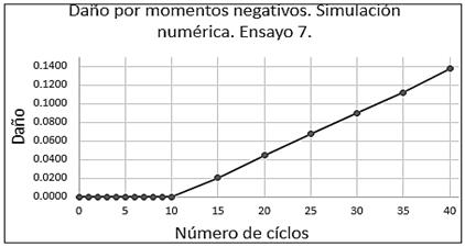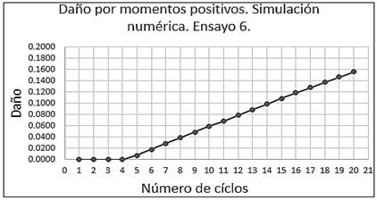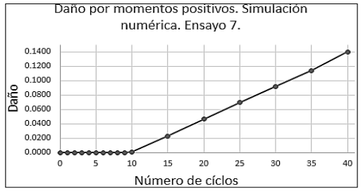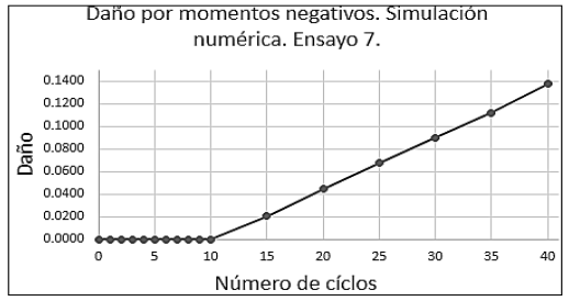 En las Figuras 14 y 15 se tiene la evolución del daño producido tanto por momentos positivos como por momentos negativos en la simulación numérica del ensayo, donde se refleja que a medida que aumenta el número de ciclos, el daño aumenta y sigue esa tendencia hasta el final de la simulación.
