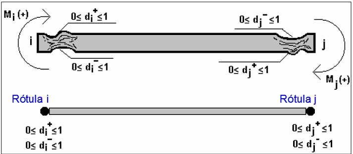, que pueden tomar valores entre 0 y 1. Un elemento estructural que considere daño por momentos negativos y positivos en ambos nodos (i,j) queda representado por el esquema mostrado en la Figura 2.