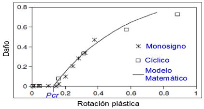 Según la investigación [3], la evolución del daño ocasionado por pandeo local representada en la Figura 4, fue obtenida mediante ensayos experimentales, debiéndose introducir el concepto de rotación plástica conductora del pandeo Pcr, para identificar el valor máximo de rotación plástica a partir del cual la variable de daño se activa y evoluciona.
