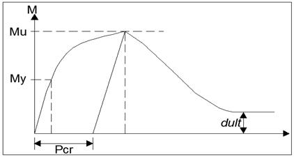 El otro parámetro a tomar en cuenta es dult, que toma en cuenta la capacidad remanente de las probetas que se aprecia en niveles de daño muy grandes, una vez se inicia la etapa de deterioro la resistencia de las probetas disminuye a medida que avanza el daño, pero tiende en forma asintótica hacia un valor de resistencia remanente que es un porcentaje de la resistencia original de la pieza llamado dult, ilustrado en la Figura 5.