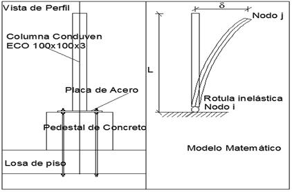 Para determinar y calibrar los parámetros del modelo matemático desarrollado por [3] se utilizaron perfiles cuadrados tubulares de pared delgada CONDUVEN ECO (producción venezolana), de sección cuadrada de 10cmx10cm de lado y espesor de pared 3,00 mm para los cuales se tomó en cuenta que todos los efectos inelásticos se producen en la rótula del nodo i mientras que la rótula del nodo j queda intacta (ver Figura 6). La nomenclatura empleada es: