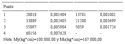 En el perfil estudiado la inercia es I=164,39cm4 y el área de la sección transversal A=10,58cm2, para la determinación del módulo de elasticidad experimental se empleó la zona elástica de la gráfica momento-rotación del ensayo de identificación de Py y Pu que va desde el punto (0;0) hasta el punto (0,00921;100.000), en donde a partir del valor de momento de 100.000 kgf*cm el comportamiento deja de ser netamente elástico. En esta zona se puede aplicar la relación entre momento rotación de una viga empotrada en un extremo y libre en el otro M=3EIϕ⁄L en donde se despeja el valor de EI=LM⁄3ϕ. Para el ensayo M=100.000 kgf*cm, L=80cm, ϕ=0,009952, por lo que EI=268.100.000kgf*cm2 y EA=174.000 kgf.