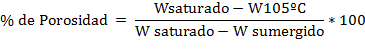 La realización del ensayo de porosidad aparente proporcionó a la investigación el porcentaje de espacios vacíos dentro de una mezcla de concreto endurecida [12]. Para esto, se elaboraron probetas cilíndricas de dimensiones 4” de diámetro y 2” de altura, considerándose el peso de las probetas saturada con superficie seca y de las probetas sumergidas, registrándose mediante una balanza hidrostática. Luego, las muestras se secaron en el horno a una temperatura de 105°C hasta obtener peso constante y se registraron los mismos. La porosidad se expresó de manera porcentual calculándose a partir de la siguiente expresión matemática: