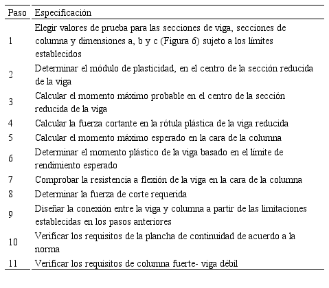 Las conexiones como se expuso anteriormente, están precalificadas para usarse en pórticos especiales a momento (SMF) dentro de las limitaciones expuesta por las especificaciones normativas descrita para el sistema, límites de precalificación en miembros de vigas y columnas, zona panel, relación columna fuerte-viga débil, configuración y detallado de cada tipo de conexión. Para realizar el chequeo de la conexión tipo RBS conforme a la normativa AISC/ANSI 358-16 [5], se procede con la siguiente secuencia de pasos (ver Tabla 1)