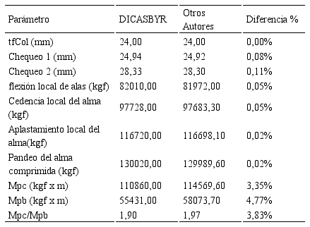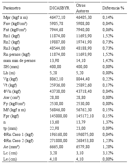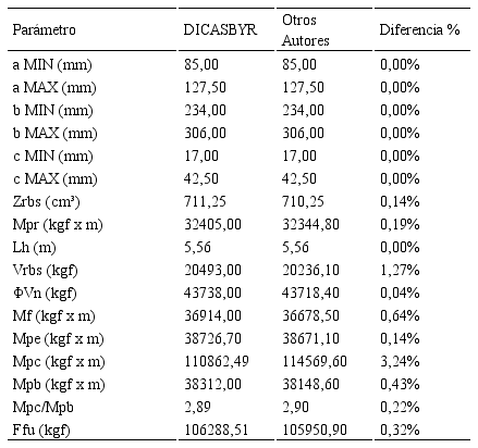 Los resultados obtenidos con el programa DICASBYR, han sido comparados con los obtenidos por otros autores. La diferencia de en porcentaje se calculó mediante la ecuación (1). Los resultados se muestran en una tabla comparativa donde se puede observar el porcentaje de diferencia entre ellos (ver Tabla 3)