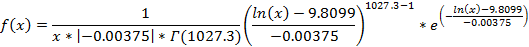 (8)Los valores de la variable Cemento se comprenden en el rango 342,85 – 436,33 Kg, su media es 389,59 Kg y su desviación 46,74 Kg. La distribución que mejor se ajusta a sus datos es la Log-Pearson 3, ésta es una curva Platicúrtica con asimetría positiva y su función de densidad de probabilidad es: