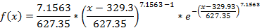 (3)Los valores de la variable Cemento se comprenden en el rango 305,99 – 344,79 Kg, su media es 325,39 Kg y su desviación 19,40 Kg. La distribución que mejor se ajusta a sus datos es la Generalizada de Valor Extremo, ésta es una curva Leptocúrtica con asimetría positiva y su función de densidad de probabilidad es:
