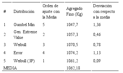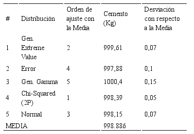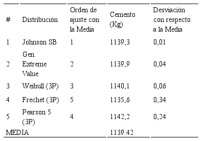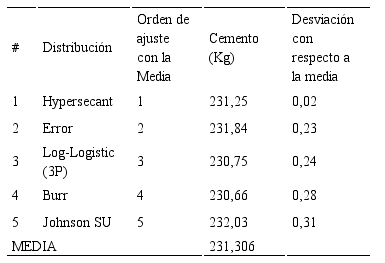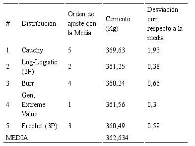 Se determinaron las distribuciones que mejor se ajustan a los datos disponibles por variable y en cada método de diseño a través del programa (ver Tabla 3). Para las cinco que mejor se ajusten, se determinó un nuevo orden de ajuste respecto a la media, con un nivel de confianza de 0,95 (ver Tabla 4). A continuación se presenta, el cálculo y análisis de los resultados obtenidos de la variable agua para el método del ACI, sólo se expondrán los resultados de las cinco distribuciones con mejor ajuste. A las demás variables se les aplicó el mismo procedimiento.