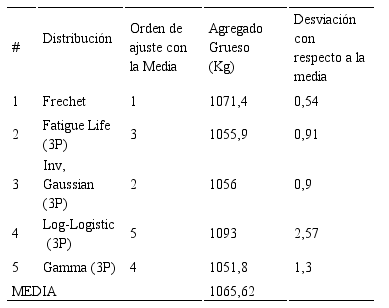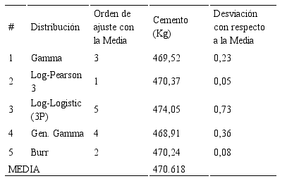 Luego de la ponderación se seleccionaron de esta columna las cinco primeras posiciones en el ajuste, las cuales para esta variable resultaron: Dagum (4P), Log-Logistic (3P), Log-Normal (3P), Pearson 5 (3P) y Gen. Gamma (4P). Con estas cinco distribuciones para una probabilidad de 0,95, se estableció un nuevo orden de ajuste considerando la desviación típica (ver Tabla 4).