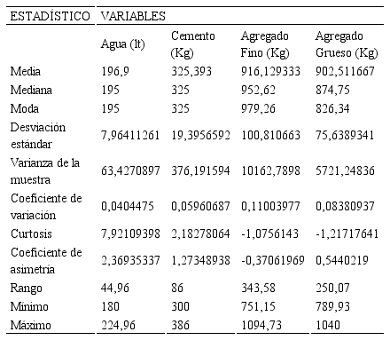 Los valores de desviación típica o estándar para cada variable son 19,28, 46,74, 116,28 y 93,07 respectivamente, valores que sirven para medir si existe dispersión baja, intermedia o alta. El coeficiente de variación para la variable Agua es de 0,096, valor menor que 0,10, evidenciando que esta variable tiene una dispersión baja en sus datos y su media es representativa para el grupo, mientras que, para las variables Cemento, Agregado Fino y Agregado Grueso se observan valores de 0,12, 0,13 y 0,11 respectivamente, valores mayores a 0,10 pero menores a 0,30, indicando una dispersión intermedia con tendencia hacia una dispersión baja, por lo que se podría considerar que la media también representa al grupo de datos. En consecuencia los rangos de valores en cada una de las variables son la media más o menos su desviación típica o estándar. Para el Agua 200,1 ± 19,28 lt, para el Cemento 389,59 ± 46,74 Kg, para el Agregado Fino 916,34 ± 116,28 Kg y para el Agregado Grueso 845,1 ± 93,07 Kg.